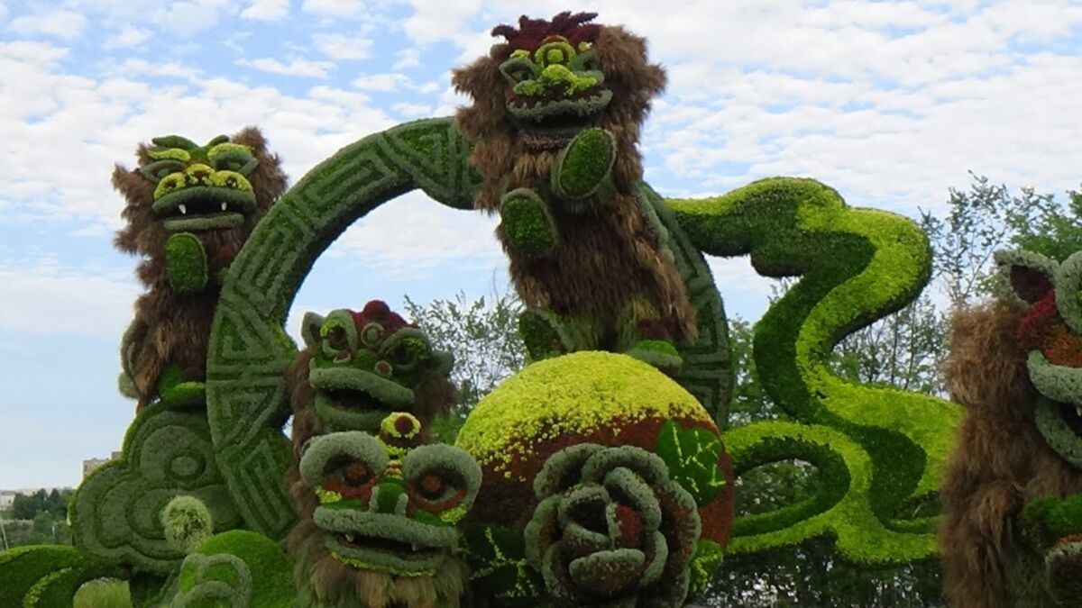文化表达维度:以 “中国民俗文化(舞狮、节庆人偶)” 为创作原型,通过绿雕艺术还原传统民俗场景,旨在传承中国民俗文化的喜庆内涵,传递热闹、吉祥的文化氛围。艺术表现维度:采用绿雕工艺,利用不同种类、色彩的植物(如绿色植被塑造主体,红色、黄色植物点缀细节),精准塑造出舞狮的神态、人偶的动作与服饰细节,既保证了造型的立体感与逼真度,又通过植物材质赋予其生态艺术的独特质感,让民俗场景以自然艺术的形式生动呈现。空间融合维度:将绿雕置于花卉缤纷的园林空间,使 “民俗文化绿雕” 与 “自然花艺景观” 深度融合,既为游客打造了可观赏、可体验的文化艺术节点,又通过花卉与绿雕的色彩呼应,提升了景观的艺术层次与文化吸引力,实现 “文化传播” 与 “景观美化” 的双重价值。