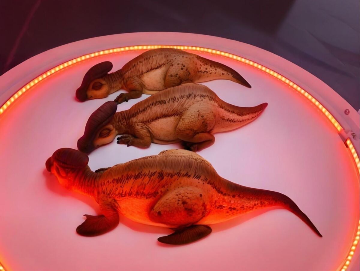 以 “恐龙孵化” 为主题的展示场景:画面中呈现了几只恐龙幼崽的仿真模型,它们形态逼真,带有纹理细节,似乎处于孵化后的幼年期。模型被放置在一个圆形展示台上,周围环绕着暖橙色的灯光,营造出类似 “孵化舱” 的氛围。背景中还有参观者(包括儿童)在观察,整体场景充满了科普的沉浸感与对恐龙生命初期的探索趣味。