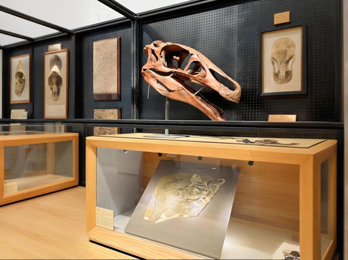 视觉冲击与分层认知:通过上方巨型霸王龙头部模型制造强烈的视觉冲击,快速抓住参观者注意力;下方展柜则呈现小型恐龙的生态场景,形成 “宏观(顶级掠食者)+ 微观(生态环境)” 的分层认知,帮助参观者全面理解恐龙的种类差异与生存环境。场景化科普:展柜内的恐龙生态模型,结合植被、地形的布置,还原了史前恐龙的栖息场景,将抽象的古生物知识转化为可感知的视觉场景,让参观者直观理解恐龙的生活习性与生态关系。受众适配与互动感:霸王龙头部的仿真设计(如张开的巨口、逼真的纹理)极具互动感,能激发儿童等受众的探索欲;展柜的玻璃设计便于近距离观察,满足不同受众对细节的探索需求,实现 “科普教育” 与 “趣味体验” 的平衡。