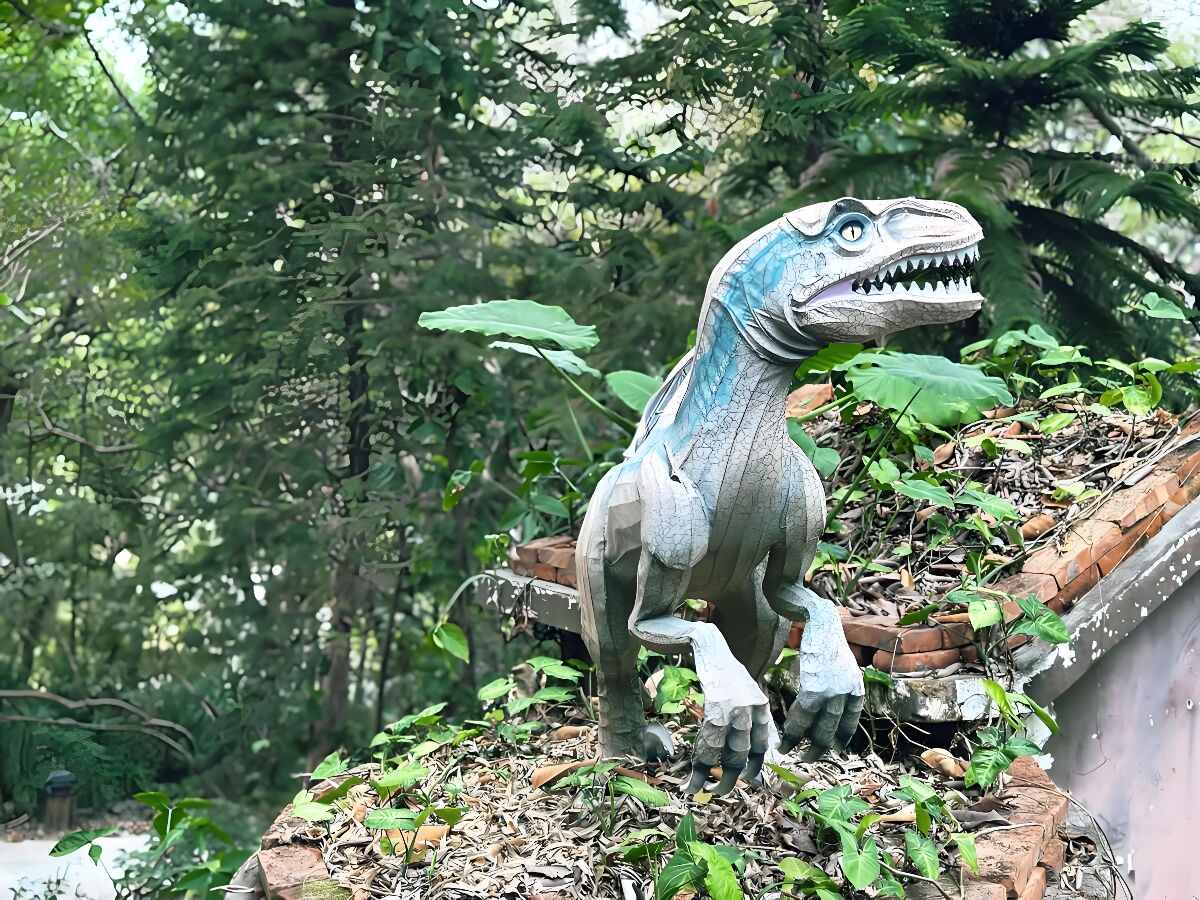 模拟史前丛林的场景,核心是一具霸王龙仿真模型,它隐藏在茂密的绿色植被(阔叶树、蕨类植物等)中,嘴巴大张,露出锋利的牙齿,姿态极具攻击性。周围是真实的树林环境,地面布满落叶与苔藓,整体氛围将恐龙的凶猛与丛林的幽深融合,营造出 “史前探险” 的沉浸感。