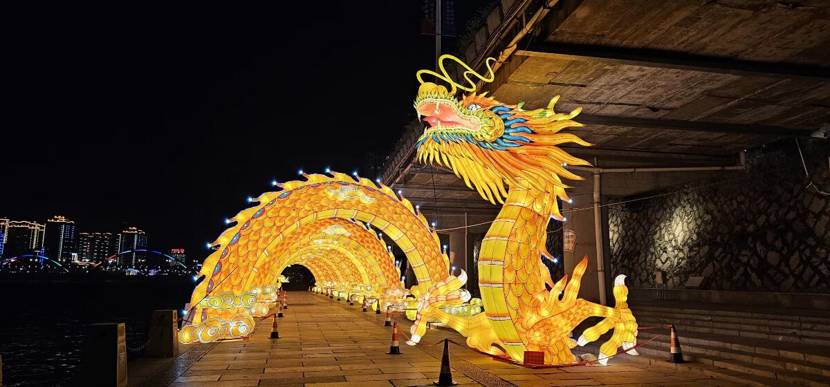 龙的造型细节充满自贡彩灯的工艺巧思:龙须的灵动卷曲、龙睛的炯炯有神、龙鳞的层次渐变,均由自贡匠人手工扎制、彩绘而成,每一片鳞片的光泽都经过反复调试,确保在夜晚灯光下呈现出 “金龙出海” 的震撼视觉效果。它盘踞在青田的江畔桥边,与城市夜景交相辉映,既是东方文化的精神图腾,也是青田华侨 “根在中华” 的情感寄托。